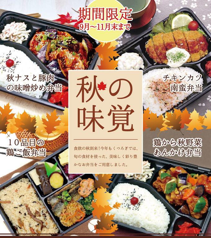 What's new 08SPT 期間限定,秋の味わいお弁当 食欲の秋到来!旬の食材を使った、美味しく彩り豊かなお弁当をご用意しました。詳細はコチラ 04JUL 期間限定!夏の味わいお弁当 今日はちょっと贅沢くつろぎの夏のお弁当!!詳細はコチラ 11MAR 期間限定,春の味わいお弁当 暖かい春こそ宅配弁当!くつろぎの春のお弁当!!詳細はコチラ 07DEC 期間限定の味わいお弁当 寒い冬こそ宅配弁当!くつろぎの冬のお弁当!!詳細はコチラ